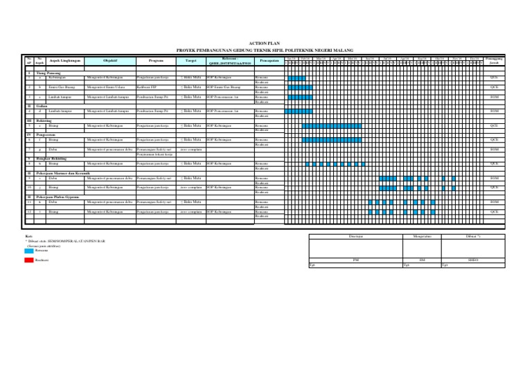 Begitu banyaknya item pekerjaan yang ada pada proyek konstruksi tentu menuntut perencanaan yang detil terhadap schedule pelaksanaan. Kita akan mengisi cell f4 untuk mengisi f4 ini ada 2 kondisi yang harus dipenuhi agar cell f4 ini bisa diberikan arsiran fill yaitu. Contoh hse plan proyek penyediaan air minum. Proyek yang dilakukan ini melibatkan perusahaan lain dan juga pemerintah daerah. Action plan dalam proyek konstruksi by jerry1yan. Hse plan proyek penyediaan air minum ini dibuat oleh pt citra panji manunggal.