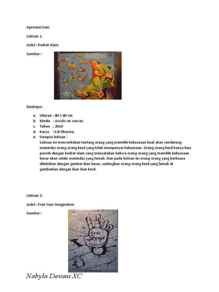 Contoh apresiasi seni lukis. Melukis ialah suatu kegiatan mengolah medium dua dimensi atau permukaan dari objek tiga dimensi untuk mendapat kesan tertentu dengan melibatkan ekspresi emosi dan gagasan pencipta secara penuh. Apresiasi seni merupakan sebuah proses penghayatan atau mengamati suatu karya seni yang dihormati serta penghargaan pada karya seni tersebut dan pembuatnya. Namun kita berkomentar nilai keindahan karya lukis harus sesuai dengan prinsip prinsip seni rupa. Selain itu jika kita artikan lebih dalam bahwa apresiasi seni adalah penilaian terhadap karya seni mulai dari. Lukisan tersebut sangat pas dengan judul yang diberikan dengan penggambaran seekor sapi yang menggigit alat lukis seakan akan ia menggambar dirinya sendiri. Sebuah karya lukis yang dibuat oleh seorang senimanpelukis harus kita apresiasi.