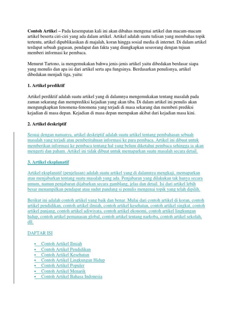 Bukan cuma menarik atau memancing melainkan judul yang mampu mengikat agar mereka membaca konten anda dan puas dengan apa yang didapatkan. Contoh artikel yang baik dan benar artikel merupakan karangan yang di tulis secara faktual dengan jumlah kata tertentu dan bertujuan untuk dipublikasikan di media cetak maupun online. Bagi anda sebagai penulis artikel yang penasaran bagaimana contoh artikel yang menarik untuk dibaca langsung. Contoh artikel pada kesempatan kali ini akan dibahas mengenai artikel dan macam macam artikel beserta ciri ciri yang ada dalam artikelartikel adalah suatu tulisan yang membahas topik tertentu artikel dipublikasikan di majalah koran hingga sosial media di internet. Setiap orang hampir bisa dikatakan bisa menulis namun tidak semua orang bisa disebut penulis.