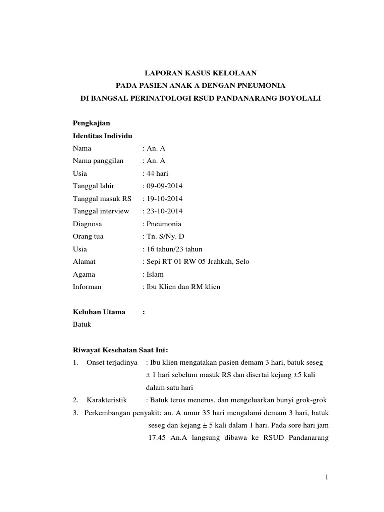 Contoh asuhan keperawatan pneumonia. Tujuan studi kasus ini adalah melaksanakan asuhan keperawatan pada klien pneumonia dengan masalah gangguan prtukaran gas. Doenges 2000 rencana asuhan keperawatan. Hudak gallo 1997 keperawatan kritis. Untuk mengetahui asuhan keperawatan pada klien dengan pneumonia meliputi pengkajian intervensi implementasi dan evaluasi keperawatan. Asuhan keperawatan pada. S dengan pneumonia yang meliputi pengkajian diagnosa intervensi implementasi evaluasi keperawatan serta pendokumentasian asuahan keperawatan.