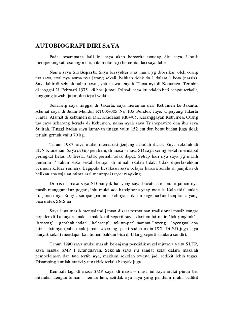 Contoh autobiografi dari lahir sampai sma. Autobiografi berisi lika liku kehidupan seseorang melewati masa masa sulit kegagalan kesedihan kebahagiaan hingga bisa mencapai keadaanya di masa kini. Dari yang paling sulit hingga mencapai keberhasilan atau prestasi yang dicapainya semasa hidupnya. Contoh autobiografi panjang. Riwayat atau perjalanan hidup seseorang mulai dari masa kecil sampai keadaannya sekarang ini yang ditulis oleh dirinya sendiri. Contoh autobiografi pengertian autobiografi adalah tulisan yang didalamnya berisi tentang pengalaman riwayat atau perjalanan hidup seseorang mulai dari masa kecil sampai keadaannya sekarang ini yang ditulis oleh dirinya sendiri. Aku lahir disebuah kampung kecil yang bernama leuwi sari tahun 1998.