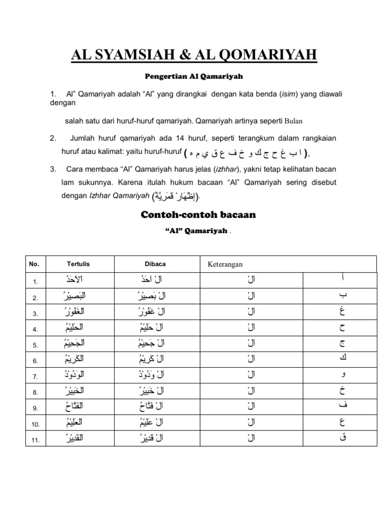 Hukum al qomariyah adalah satu di antara dua hukum terkait hukum bacaan alif lam pada kata benda di dalam bahasa arab lebih lebih al quran. Dalam mempelajari ilmu tajwid anda harus sering membaca dan memperhatikan satu persatu hurufnya dengan tertib dan teliti dibiasakan untuk membaca dengan tartil supaya anda. Contoh contoh dari hukum alif lam syamsiah diatas kami ambil dari surat surat pendek juz amma dan juga beberapa surat dalam al quran supaya kita semua dengan mudah mempelajari tentang alif lam khususnya alif lam syamsiah. Secara pengertian di dalam ilmu tajwid al qomariyah adalah hukum bacaan yang disematkan ketika huruf al qomariyah berada setelah alif lam. Alif lam syamsiyah adalah hukum bacaan alif lam ال yang apabila bertemu salah satu huruf syamsiyahhukum bacaannya disebut idgham syamsiyah atau termasuk huruf lam syamsiyah. Alif lam qamariyah adalah salah satu bacaan tajwid yang harus dimengerti oleh setaip muslim yang mempelajari alquran.