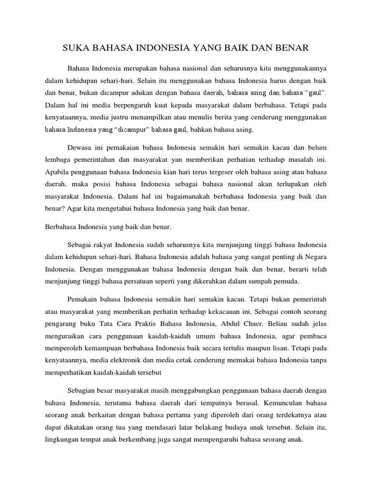 Contoh bahasa indonesia yang baik dan benar. Kali ini didalam tulisan ini telah menghadirkan salah satu artikel informasi yang sangat bermanfaat untuk banyak orang. Ragam bahasa di bedakan berdasarkan cara pandang pembicara media yang di gunakan dan topik yang sedang di bicarakan. Pidato biasanya di gunakan sebagai kata sambutan atau pembukaan pada suatu acara. Sebagai bangsa indonesia yang baik tentu kita mencintai bahasa indonesia. Kalimatid contoh kalimat efektif bahasa indonesia adalah bahasa yang kaya dan indah. Contoh diatas adalah contoh bahasa indonesia yang baku dan benartetapi tidak baik dan tidak efektif karena tidak cocok dengan situasi pemakaian kalimat kalimat itu untuk situasi seperti diataskalimat 3 dan 4 berikut akan lebih tepat.