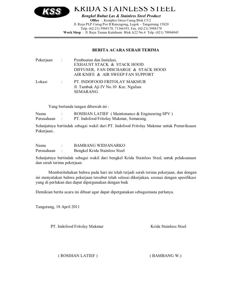 Dalam surat berita acara pastikan untuk menulis pihak pihak yang terlibat dalam acara tersebutpastikan detail dari pihak pihak tersebut tidak terlewatkan seperti nama tanggal lahir jenis kelamin alamat pekerjaan jabatan dan yang lainnya karena hal ini penting. Contoh berita acara penyerahan pekerjaan berita acara merupakan salah satu dokumen penting dalam sebuah kegiatan diperusahaan misalnya saat melakukan tanda tangan persetujuan kerjasama melakukan sebuah perjanjian bisnis melakukan mergerisasi perusahaan pengadaan barang atau inventaris kantor. Surat berita acara pekerjaan atau sering dikenal dengan surat berita acara serah terima barang atau surat berita acara selesai pekerjaan adalah surat yang dibuat setelah kita menyelesaikan pekerjaan kemudian surat tersebut ditandatangani oleh kedua belah pihak yaitu kita dan perwakilan dari instansi yang memberi pekerjaan kepada kita. The file extension pdf and ranks to the documents category. Surat berita acara serah terima pekerjaan proyek adalah surat yang dibuat oleh suatu pihak untuk memberikan informasi atau untuk menjadi sebuah bukti bahwa telah terjadi serah terima suatu pekerjaan proyek dari satu pihak kepada pihak lainnya. Contoh berita acara tersebut benar benar diperlukan untuk mereka yang mengalami kesusahan dalam membikinnya atau juga malahan yang masih belum tahu dan paham apa itu berita acara.