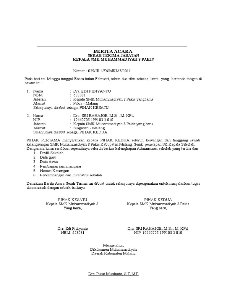 Contoh surat berita acara serah terima jabatan kepala sekolahmadrasah sahabat abdan pada pertemuan kali ini saya kembali akan membagikan contoh surat yaitu surat berita acara serah terima jabatan kepala sekolah atau madrasahsurat berita acara ini biasanya ditulis ketika terjadi pergantian kepala sekolah madrasah. Yang bisa digunakan untuk melengkapi administarsi guru yang dapat di unduh secara gratis dengan menekan tombol download. Hal ini sudah menjadi kebiasaan yang bisa dibilang wajib karena memang setiap sekolah melaksanakannya. Ketika anda membuat surat ini anda harus memperhatikan tentang kaidah atau aturan aturan di dalam pembuatan surat resmi seperti dengan mencantumkan kop surat tanggal dan lain sebagainya seperti halnya ketika anda membuat contoh surat pemberitahuan dinas sekolah kegiatan kampus dan kegiatan rt paling lengkap atau juga contoh surat pengunduran diri organisasi. Contoh surat serah terima jabatan terbaru serah terima jabatan dalam sebuah perusahaan atau organisasi adalah hal yang sudah umum dilakukan. Berita acara serah terima jabatan kepala sekolah doc.