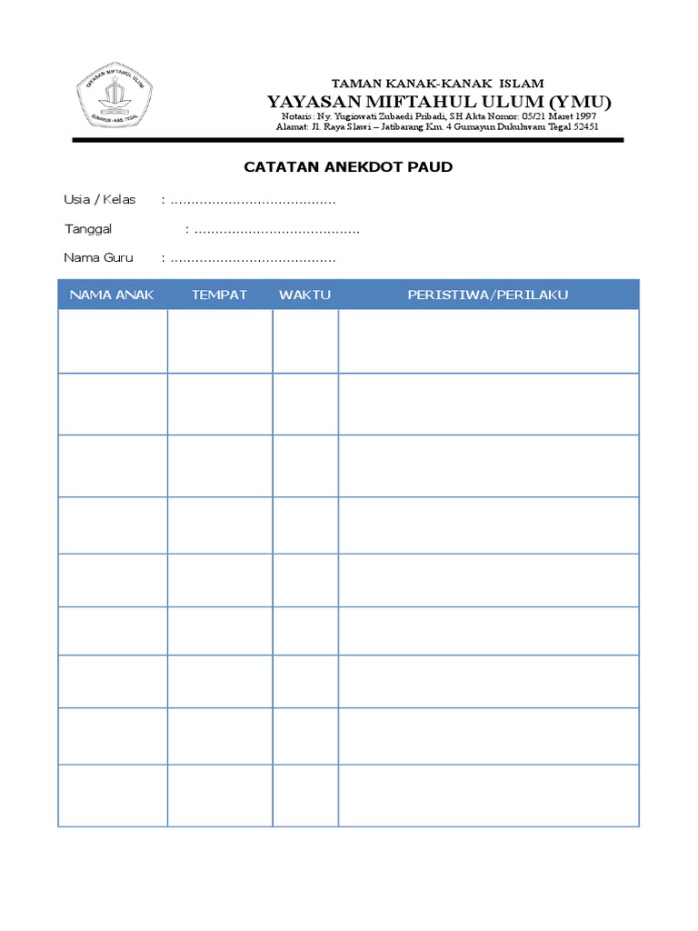 Berbagai rujukan terakhir menyatakan bahwa catatan anekdot digunakan untuk mencatat seluruh fakta menceritakan situasi yang terjadi apa yang dilakukan. Jurnal harian paud download format contoh catatan anekdot anak paud kurikulum 2013 disini. Pengertian satatan anekdot adalah salah satu alat untuk mengumpulkan data tentang tingkah laku yang diluar dari kebiasaannya. Download contoh catatan anekdot anak paud kurikulum 2013 usia 3 4 5 6 siswa format docx atau docs gratis. Catatan anekdot awalnya digunakan untuk mencatat sikap dan perilaku anak yang muncul secara tiba tiba atau peristiwa yang terjadi secara insidental. Contoh format catatan penilaian anekdot paud tk ra kurikulum 2013 merupakan alat perekam observasi secara berkala terhadap suatu peristiwa atau kejadian penting yang melukiskan perilaku anak yang terjadinya tidak umum atau kejadian khusus yang diuraikan dalam bentuk pernyataan singkat dan obyektif.