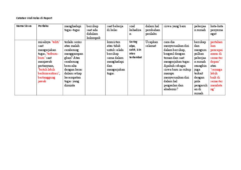 Contoh catatan wali kelas untuk pengisian erapor catatan wali kelas merupakan deskripsi penilaian secara keseluruhan baik dari segi pengetahuan keterampilan sikap sosial sikap religius maupun tingkah laku sehari hari siswa atau peserta didik selama di kelas dan di sekolah. Selalu berusaha untuk mematu tata tertib juga terhadap guru tingkatkan motivasi belajar dan kurangi aktivitas menyendiri.
