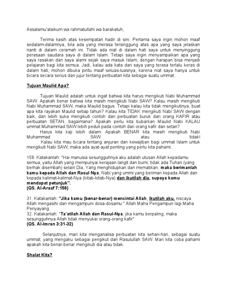 Contoh teks pidato dan ceramah tentang peringatan maulid nabi muhammad saw assalamualaikum wr wb. Jika ingin mengutip baik itu sebagian atau keseluruhan dari isi artikel ini harap menyertakan link dofollow ke https. Mari kita berfikir tentang berapa banyak dari kita yang tidak peduli pada contoh mulia nabi muhammad saw. Alhamdulillahirabbil alamin washolatu wasalamu ala asyrafil anbiya wal mursalin waala alihi washohbihi ajmain. Sebelum anda memberi ceramah ada baiknya menyusun terlebih dahulu isi ceramah anda atau menyiapkan beberapa konsep text ceramah maulid nabi. Silahkan pilih pembukaan pidato di contoh pembukaan ceramah kaum muslimin dan muslimat yang saya hormati dan.