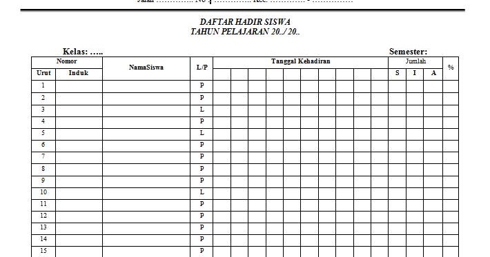 Contoh daftar hadir siswa. Pada saat memasuki tahun ajaran baru atau memasuki tahun pergantian semester banyak perangkat sekolah yang harus di buat atau di rubah dan di perbaiki salah satunya adalah daftar hadir siswa di kelas. Melihat daftar hadir siswa 1. Pada postingan sebelumnya saya telah membagikan format daftar hadir sekaligus berisi daftar nilai siswa untuk setiap guru mata pelajaranyang dapat di gunakan sebagai. Selanjutnya adalah kita membuat halaman atau lembar kerja di spreadsheet ini sama halnya dengan exel pada microsoft exel jadi data daftar hadir siswa akan terkumpul di sini. Contoh absensi daftar hadir siswa excel add comment sahabat guru tentu sudah tidak asing lagi dengan salah satu administrasi kelas ini yaitu daftar hadir siswa kelas daftar hadir siswa ini biasa di rekap buat keperluan papan data dan raport dll nah berikut beberapa contoh absensi daftar hadir siswa excel yang bisa anda download. Isi yang ada pada contoh absensi dan daftara hadir siswa ini mencakup semua bulan mulai dari januari februari maret april mei juni juli agustus sebtember desember semua komplit anda bisa menggunakan format aplikasi absensi ini sebagai sumber referensi untuk absensi siswa pada sekolah sd sekolah smp sekolah sma ataupun smk.