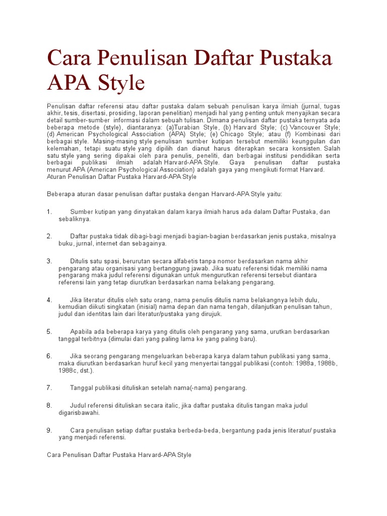 Penulisan daftar pustaka yang benar cara membuat contoh dalam penulisan sebuah karya ilmiah kita diharuskan untuk menyajikan suatu informasi dengan disertai sumber yang benar. Standart yang ditetakan sebagai pedoman penulis daftar pustaka salah satunya adalah harvard style atau apa american psychological association. Beberapa ciri penulisan daftar pustaka dengan apa style adalah. Gaya penulisan daftar pustaka menurut apa american psychological association adalah gaya yang mengikuti format harvard. Menulis daftar pustaka apa style seperti janji saya pada post sebelumnya kali ini saya akan membahas mengenai tata cara menuliskan daftar pustaka yang mingikuti format apa style. Contoh daftar pustaka selamat datang di portal hidupsimpel.