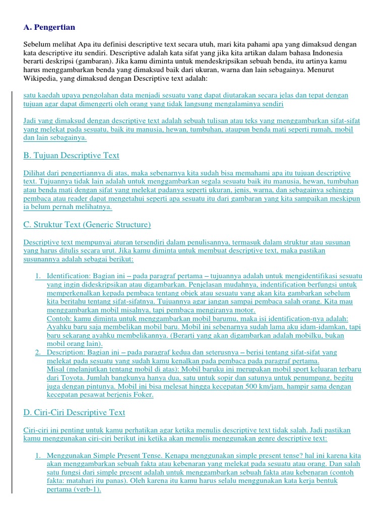 Jika kamu sedang ingin. Untuk lebih jelas silakan lihat apa itu descriptive text. Tulisan dengan genre descriptive text bertujuan untuk menggambarkan dengan detil dan jelas tentang sesuatu yang menjadi topik tulisan.