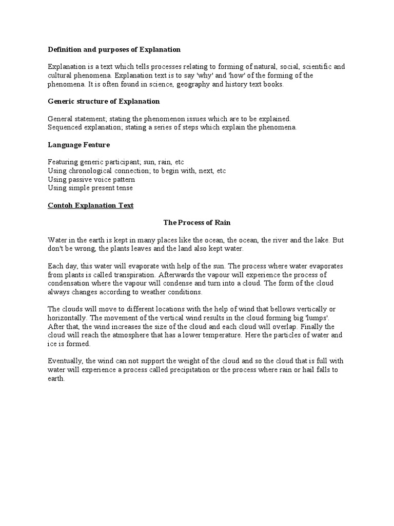 Dengan kata lain explanation text adalah sebuah text yang berfungsi untuk menjelaskan proses terjadinya suatu peristiwa atau suatu hal secara detail contoh peristiwa terjadinya hujan dari uap air atau tsunami dan kejadian lainya yang memiliki unsur kejadian alam budaya sosial dan lain. We all know that rain is primary source of fresh water for most areas of the world providing suitable condition for diverse ecosystems.