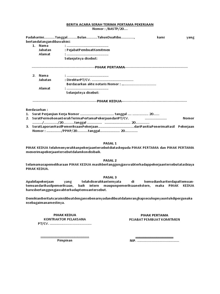 Berita acara serah terima pekerjaan memuat keterangan yang begitu detail dan penting bahkan banyak yang menggolongkannya sebagai dokumen tentang kronologi kepentingan pekerjaan. Demikianlah berita acara serah terima barang ini di perbuat oleh kedua belah pihak adapun barang barang tersebut dalam keadaan baik dan cukup sejak penandatanganan berita acara ini maka barang tersebut menjadi tanggung jawab pihak kedua memlihara merawat dengan baik serta dipergunakan untuk keperluan tempat dimana barang itu dibutuhkan. Surat berita acara serah terima pekerjaan proyek memiliki fungsi yang sama seperti kuitansi dimana pada saat suatu pekerjaan proyek telah diselesaikan dan hendak diberikan kepada pihak pemilik proyek maka akan diberikan sebuah surat serah terima. Contoh berita acara serah terima pekerjaan related posts to contoh berita acara serah terima pekerjaan resign contoh berita acara serah terima pekerjaan resign 2016 12 11t074900 0800 rating. Berita acara serah terima jabatan. Surat berita acara serah terima pekerjaan proyek ini dapat digunakan sebagai catatan administrasi.