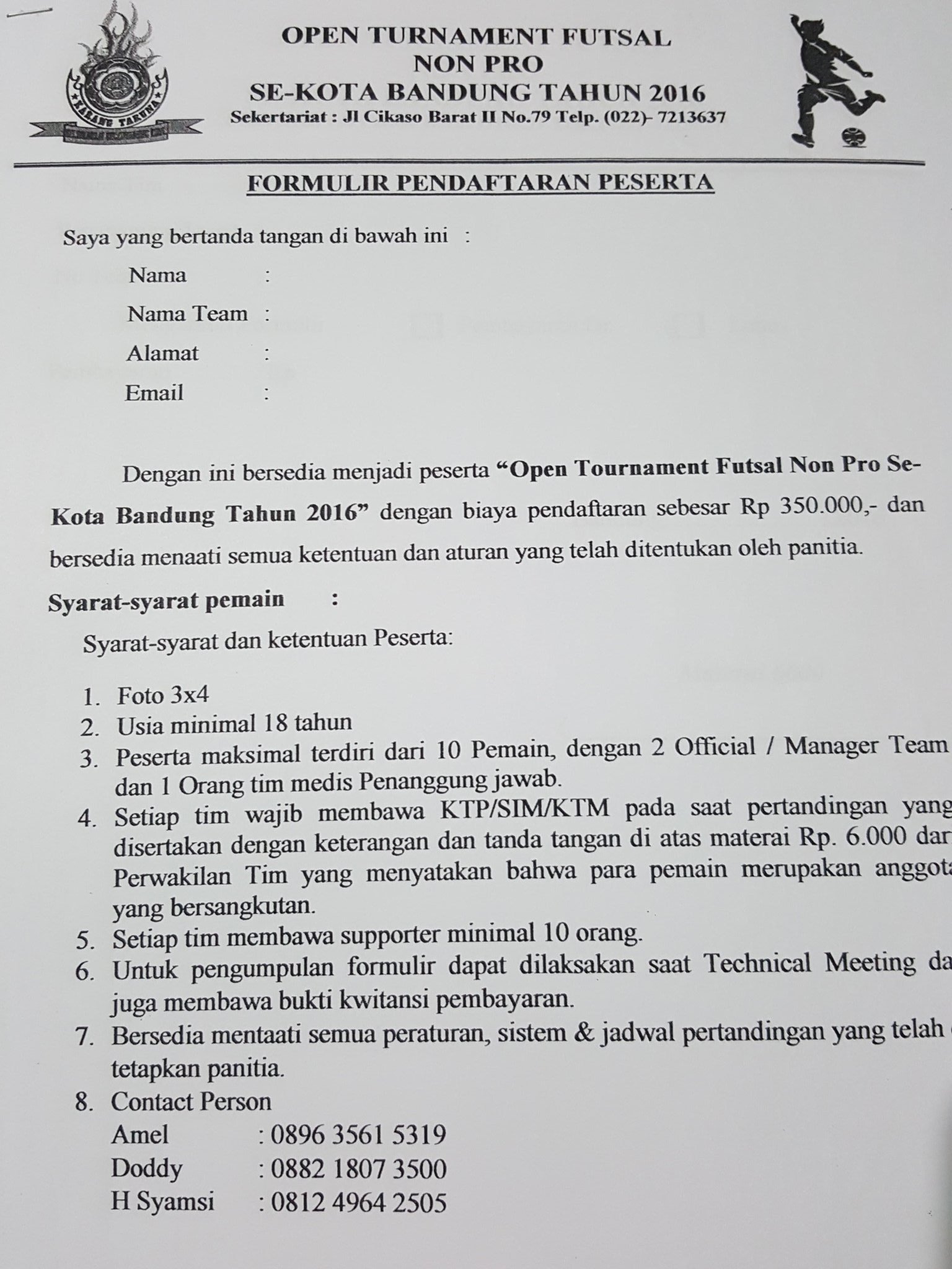 Formulir pendaftaran peserta futsal fik cup 2017 saya yang bertanda tangan dibawah ini. Formulir pendaftaran law futsal championship invitational 2013 dapat didownload disini jadwal kegiatan futsal jadwal kegiatan tanggal pendaftaran 3 30 oktober 2013 technical meeting 19 nevember 2013.