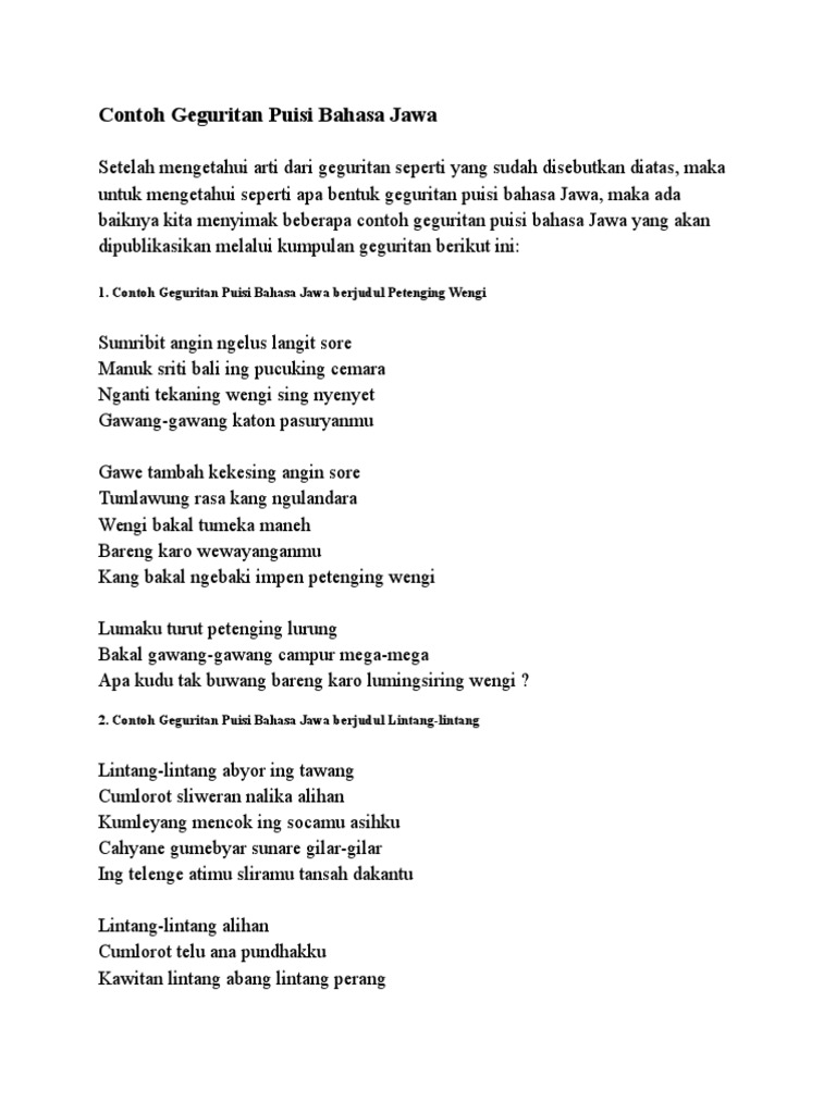 Contoh geguritan bahasa jawa. Pengertian di jawa mengenai geguritan telah mengalami perkembangan dan bisa disebut juga dengan puisi bebas. Geguritan bahasa jawa merupakan perkembangan dari tembang sehingga dikenal beberapa jenis jenis geguritan yang berbeda beda. Puisi bahasa jawa puisi bahasa jawa biasa disebut dengan geguritan adalah bentuk puisi yang berkembang di kalangan masyarakat penutur bahasa jawa dan bali. Sekarang setiap orang bisa membuat geguritan jawa tanpa harus menggunakan bahasa jawa kromo yang penting isinya tetap bermakna. Geguritan berkembang dari tembang jawa yaitu liriksajak yang mempunyai irama nada dalam bahasa indonesia disebut lagu. Geguritan dalam bentuk awalnya berwujud nyanyian yang memiliki sanjak tertentu.