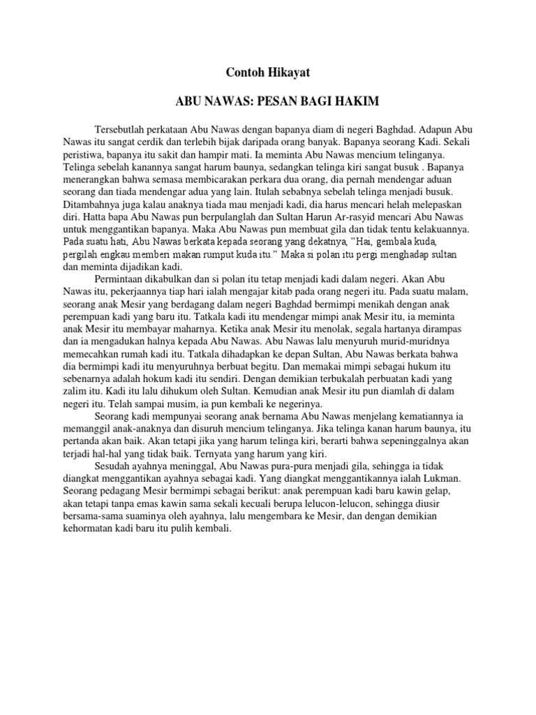 Contoh hikayat abu nawas. Akhirnya abu nawas dapat menyelesaikan masalah pria dan rumah sempitnya itu. Sekali peristiwa bapanya itu sakit dan hampir mati. Ia bingung dengan masalah yang sedang ia hadapi. Contoh teks hikayat abu nawas dan botol ajaib. Unsur ekstrinsik hikayat abu nawas botol ajaib µ nilai sosial nilai sosial yang terkandung yaitu seseorang seperti baginda raja walaupun memiliki jabatan yang tinggi ia tetap membutukan bantuan orang lain untuk menyelesaikan masalah yang dihadapinya. Hikayat ini merupakan salah satu kisah yang diceritakan dalam kumpulan kisah 1001 malam yang sangat populer di zamannya.