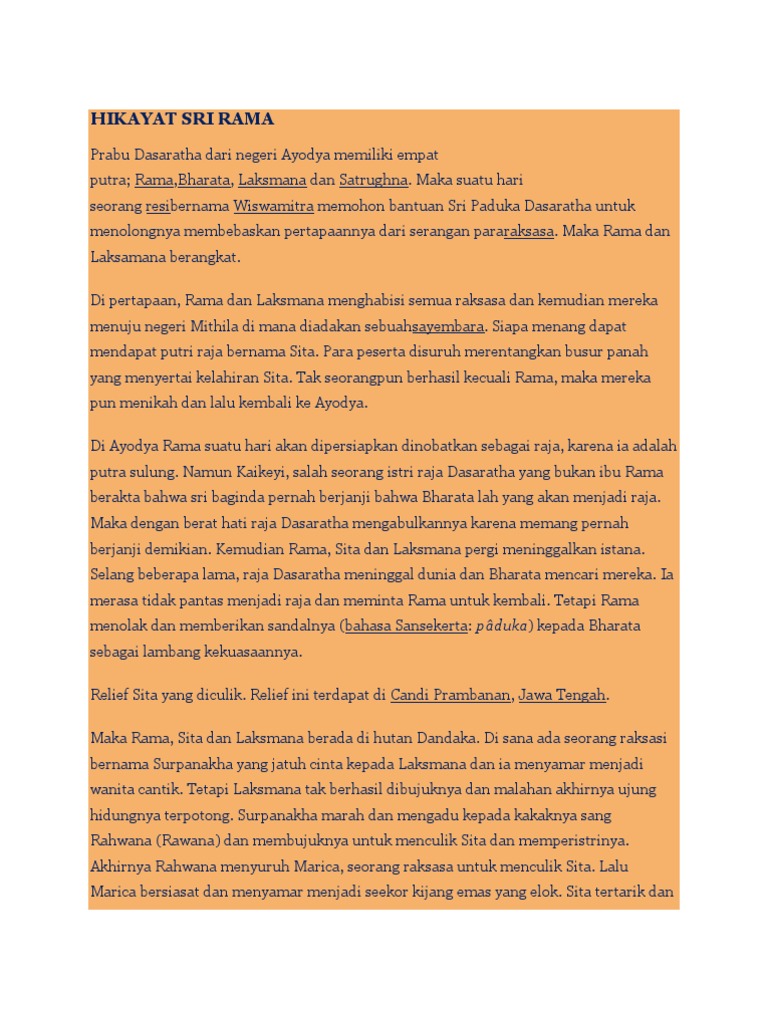Contoh hikayat sri rama hikayat sri rama. Saat sri rama dan laksamana berjalan di dalam hutan mereka bertemu dengan seekor burung jantan dan empat ekor burung betina. Hikayat sri rama. Versi yang diterbitkan oleh roorda van eysinga dan versi yang diterbitkan oleh w. Hikayat sri rama pada suatu hari sri rama dan laksamana pergi mencari sita dewi. Hikayat sri rama pada suatu hari sri rama dan laksamana pergi mencari sita dewi.