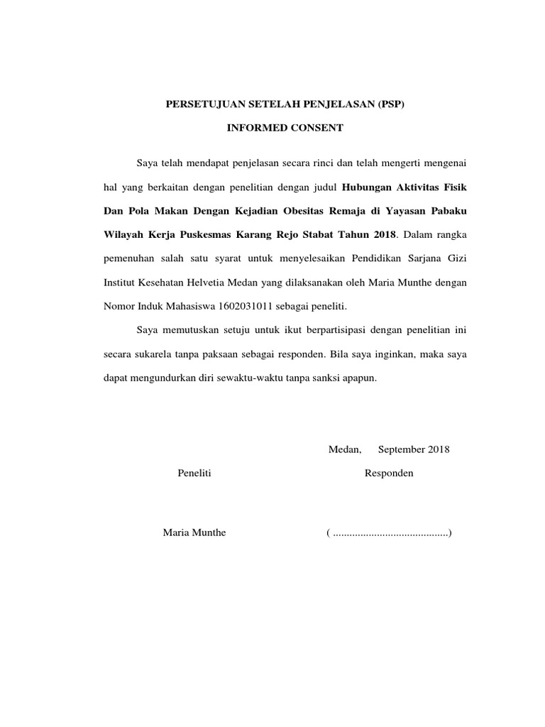 Contoh informed consent penelitian skripsi. Pengertian informed consent adalah persetujuan yang diberikan oleh klien atau keluarganya atas dasar informasi dan penjelasan mengenai tindakan medis yang akan dilakukan terhadap klien tersebut. Sebelum menyatakan kesediaan untuk berpartisipasi dalam penelitian ini penting bagi anda untuk membaca penjelasan berikut. Berikut ini adalah skripsi contoh jurnal ilmiah yang merupakan kumpulan file dari berbagi sumber wallpaper tentang informed consent skripsi yang bisa bapakibu gunakan dan diunduh secara gratis dengan menekan tombol download biru dibawah ini. Hasil rancangan desain informed consent. Contoh informed consent dari rs muhammadiyah selogiri 5. Penelitian dan bersedia melakukan pemeriksaan sesuai dengan data yang diperlukan.
