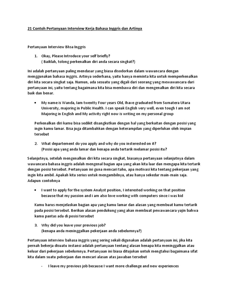 Orang orang dihantui rasa takut akan melakukan kesalahan pada saat wawancara. Contoh dialog interview wawancara dalam bahasa inggris 2 orang beserta artinya by pustaka bahasa inggris posted on january 4 2019 december 4 2019 dear readers. 15 pertanyaan interview bahasa inggris plus arti dan contoh jawabannya saat wawancara kerja dengan bahasa inggris pertanyaan interview bahasa inggris pasti akan menjadi momok utama terutama kalau kamu tidak begitu mahir berbahasa inggris. 5 contoh percakapan bahasa inggris singkat dalam interview kerja hai sahabat sbi yang super dalam tes masuk kerja kita sering menemui tahapan interview dimana kita akan diberikan bermacam macam jenis pertanyaan yang bertujuan untuk menguji skill dan kemampuan sebagai seorang karyawan yang layak. Contoh dialog interview kerja dalam bahasa inggris interview kerja adalah salah satu tahap yang paling menegangkan bagi sebagian orang. Akan jauh lebih baik kalau dipahami saja kata katanya kemudian coba menyusun kalimat sendiri yang walau tidak persis sama tapi maksudnya sama.