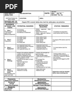 Contoh job safety analysis pdf. Job safety analysis adalah sebuah metode yang digunakan oleh pekerja untuk mengidentifikasi bahaya yang ada dalam setiap tahapan pekerjaan dan penentuan pengendalian terhadap bahaya tersebut. A job safety analysis is a procedure that can help a company integrate accepted safety and health principles and practices into a particular task or job operation. Gowa 2017 skripsi diajukan untuk memenuhi salah satu syarat meraih gelar sarjana kesehatan masyarakat prodi kesehatan. Dengan membuat serta mensosialisasikan job. In a jsa every step even the most basic. People who apply for jobs especially jobs that require them to do certain physical tasks would usually find these risks indicated in their job assessment forms.