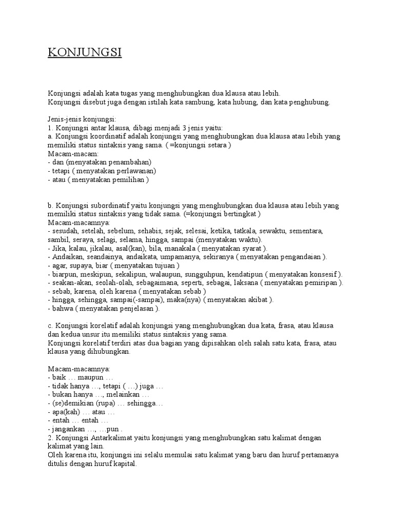 Konjungsi antar kalimat merupakan kata penghubung yang menghubungkan kalimat yang satu dengan kalimat yang lainnya. Contoh konjungsi antar kalimat diantaranya. Oleh karena itu namun sebelum itu akan tetapi dengan demikian kecuali itu selain itu sesudah itu sebaliknya. Sebuah paragraf lazimnya disusun oleh kalimat kalimat yang satu sama lain berhubungan sehingga membentuk kesatuan yang bersifat kohesif dan koheren. Dalam penggunaanya konjungsi antar kalimat menyatakan makna yang berbeda beda diantaranya. Konjungsi koordinatif pendampingan merupakan sebuah konjungsi yang menyatakan bahwa salah satu unsur dari klausa atau kalimat merupakan suatu pendamping bagi kata klausa frasa atau kalimat sebelumnya.