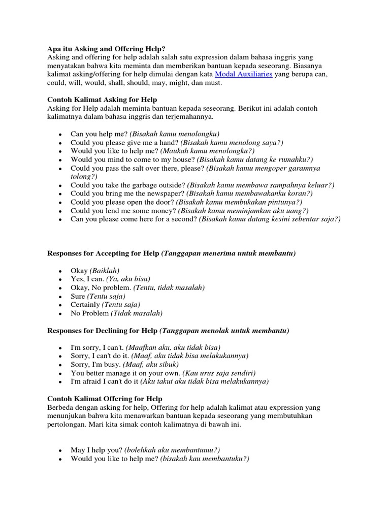 Contoh kalimat offering help. Bagi yang masih belum tahu cara untuk menawarkan bantuan dalam bahasa inggris silahkan disimak baik baik ya guys contoh percakapan bahasa inggris tentang offering help beserta artinya berikut ini. Sebelum melihat beberapa contoh dialog bahasa inggris expressing offering help mari kita pahami terlebih dahulu pengertiannya. Menurut kbbi attau kamus besar bahasa indonesia menawarkan memiliki arti mengunjukkan sesuatu kepada seseorang. Contoh dialog offering help yang paling sering digunakan dalam percakapan bahasa inggris baik antar dua atau tiga orang dimana jenis dialog ini memiliki ciri yang sangat khas sekali dengan beberapa kalimat yang menandakan jika jenis dialog yang sedang berlangsung memiliki kandungan offering help yang tentunya juga sangat mudah untuk di ketahui. Offering help adalah suatu ungkapan yang digunakan untuk menawarkan sebuah pertolongan kepada orang lain. Simaklah contoh percakapan berikut ini agar lebih jelas bagaimana menggunakan ekspresi ekspresi di atas dalam kehidupan sehari hari.