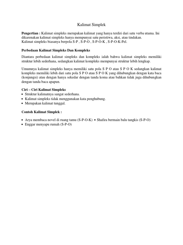 Kalimat simpleks dan kompleks pada aktivitas manusia pasti selalu ada yang namanya interaksi sosial dengan sesama makhluk lainnyadalam interaksi tersebut pasti ada percakapan yang akan dilakukan dengan lawan bicara anda. Semoga dapat dipahami dengan baik dan bisa membantu menyelesaikan tugas bahasa indonesia anda. Pengertian jenis dalam hal ini di bahasa indonesia sendiri memiliki 2 macam jenis kalimat yakni kalimat simpleks dan kalimat kompleksyang dimana kedua kalimat ini memiliki pengertian dan ciri ciri yang berbeda. Kelima contoh kalimat tersebut adalah kalimat simpleks karena hanya ada satu predikat dan satu subjek.
