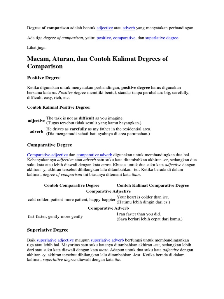 Agar lebih mudah memahami suatu hal bila kita sudah lihat contohnya atau penerapannya. Berikut adalah beberapa contoh pemakaian superlative degree dalam percakapan sehari hari. Perubahan regular pada adjectives beserta contoh kalimat degree of comparison. Contoh superlative degree. 20 contoh soal superlative degree adjective dan jawabannya pada kesempatan kali ini kita akan membahas tingkatan ketiga dari degree of comparison yaitu superlative degreesuperlative degree memiliki dua macam bentuk yaitu adverb dan adjectivesebelum kita melihat contoh soal dari superlative degree dalam bentuk adjective hendaknya kita pahami dulu tentang pengertian dari superlative. Degree of comparison yang pertama adalah positive sedangkan yang ketiga adalah superlative.