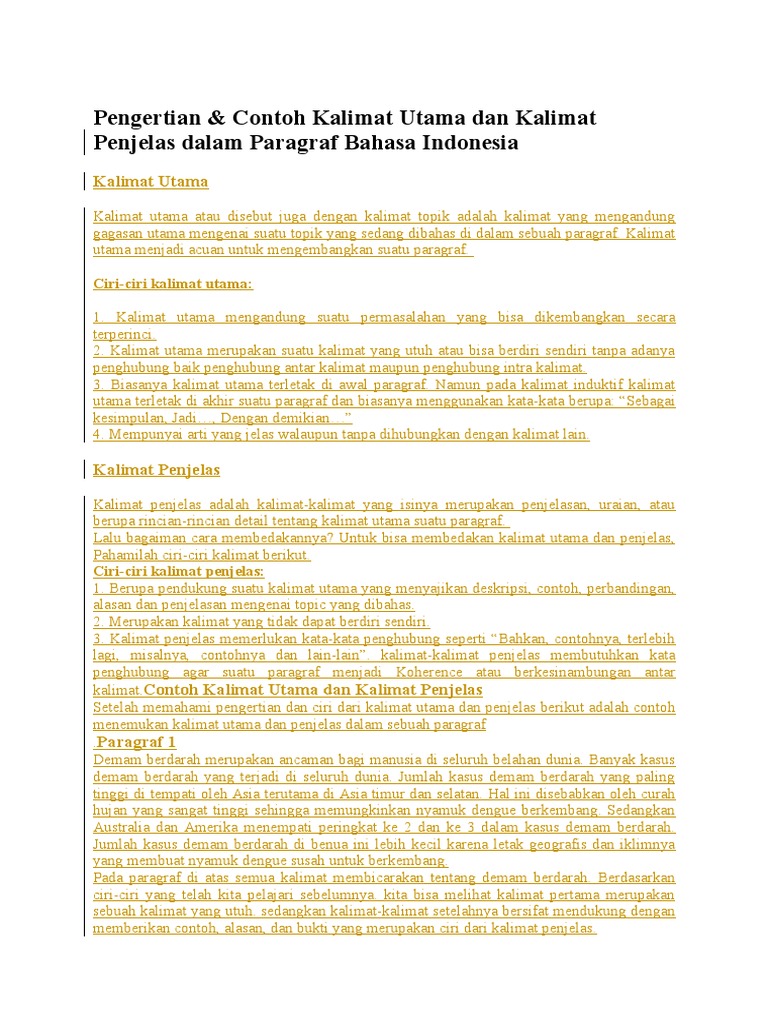 Contoh kalimat penjelas pengertian ciri dan fungsinya untuk pembahasan kali ini kami akan mengulas mengenai kalimat penjelas yang dimana dalam hal ini meliputi pengertian ciri fungsi dan contoh nah agar lebih memahami dan dimengerti simak ulasannya dibawah ini. Kalimat utama terletak di awal dan akhir paragraf campuran kalimat utama. 1 kesehatan adalah kekayaan terbesar yang wajib dijaga. Kalimat penjelas juga dapat diartikan sebagai sebuah kalimat yang berisikan mengenai penjelasan ataupun rincian secara lebih mendetail terkait dengan kalimat utama yang ada dalam sebuah paragraf. Pengertian kalimat penjelas ciri dan contoh kalimat penjelas lengkap kalimat penjelas adalah kalimat yang bersifat khusus dan berfungsi untuk mengembangkan gagasan utama atau kalimat utama pada suatu paragraf. Kalimat utama yang terdapat pada paragraf di atas urutan nomor lima untuk kalimat lainnya ada urutan satu dua tiga empat adalah salah satu kalimat penjelas.