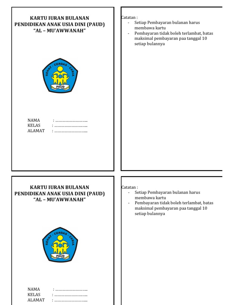 Percayakan urusan cetak mencetak kartu iuran setoran angsuran spp kartu pasien anda kepada kami. Berikut adalah contoh format kartu iuran bulanan untuk paud dan tk yang bisa digunakan dan diedit dengan mudah sesuai kebutuhan masing masing sekolah.
