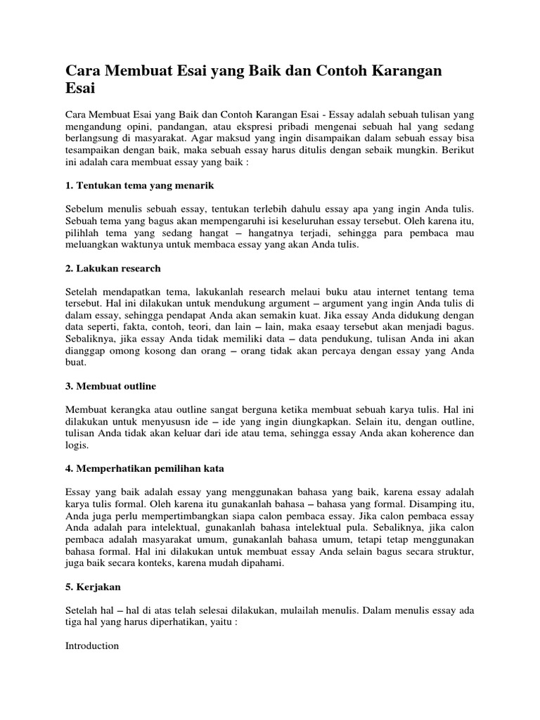 Contoh karya tulis essay. Yang pertama adalah latar belakang yang sebagai awal pembahasan. Seperti halnya dalam menulis karya ilmiah menulis essay yang baik juga harus terstruktur dan sistematis. Setelah itu anda bisa menggali jawaban jawaban dari pertanyaan yang telah anda buat dari jawaban jawaban itulah anda bisa menarik kata kunci yang kemudian bisa dianalisis lebih jauh untuk menjadikan sebuah karya tulis yang baik. Secara umum contoh essay mempunyai tiga susunan yang biasa disebut dengan badan atau tubuh esai. Akan tetapi kuhusus untuk pembuatan essay yang baik. Sebelum anda membuat essay alangkah baiknya jika anda membuat pertanyaan mengenai suatu topik.