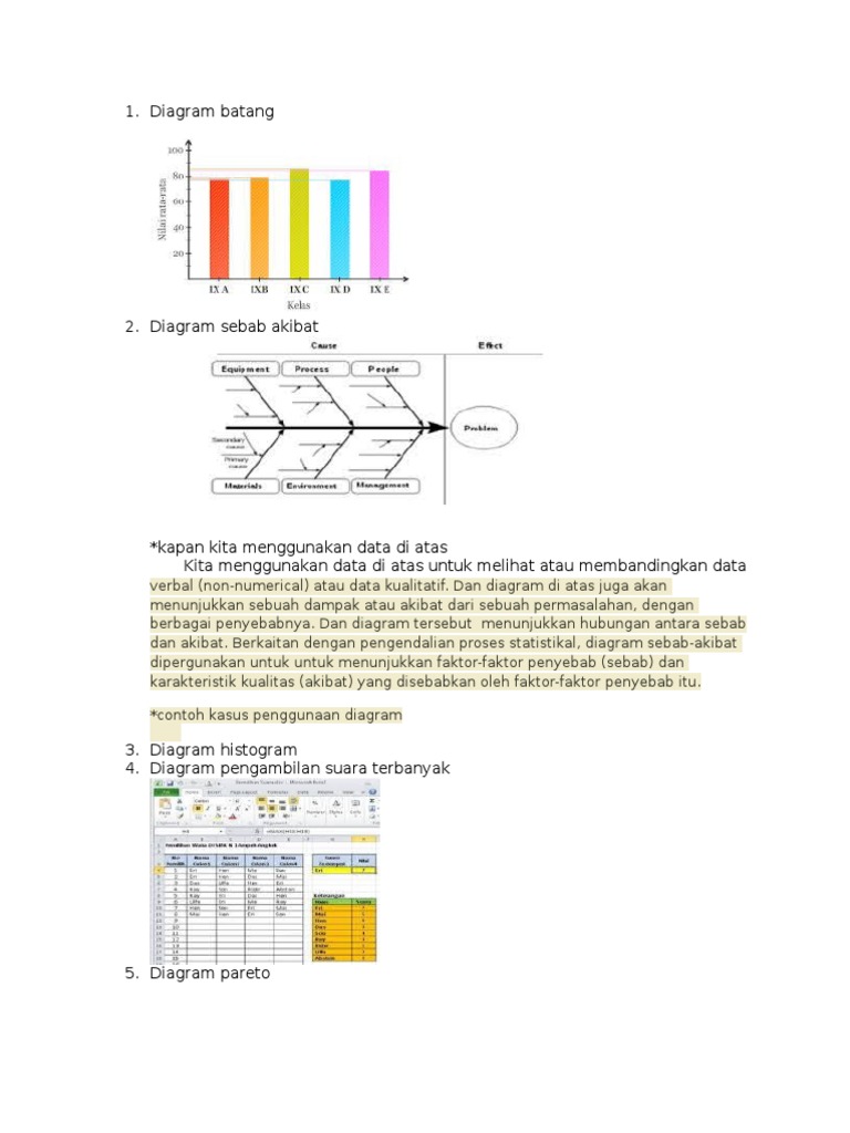 Contoh diagram pareto contoh di atas adalah contoh sederhana dari sebuah diagram pareto dengan menggunakan sampel data frekuensi relatif dari penyebab ip rendah. Sehingga untuk mengurangi total kerugian kita dapat berfokus pada 4 masalah tersebut dari pada keseluruhan masalah yang ada namun tetap memberikan implikasi yang besar terhadap pengurangan total. Berikut tampak seharusnya dari analisis contoh ini. Contoh grafik pareto tentang deadline yang terlewat untuk produksi material marketing. Diagram pareto merupakan langkah awal. Pengertian diagram pareto dan cara membuatnya diagram pareto merupakan salah satu tools alat dari qc 7 tools yang sering digunakan dalam hal pengendalian mutu.