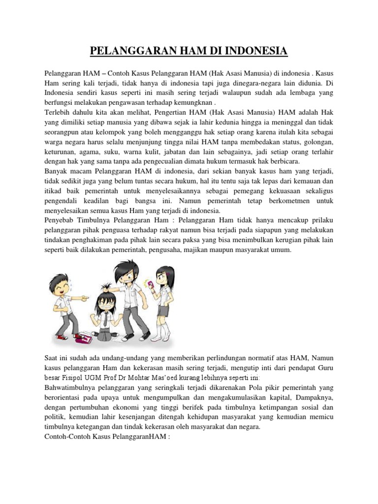 Yang termasuk dalam pelanggaran ham diantaranya pembunuhan dan pelecehan berikut penjelasan mengenai pelanggaran ham serta contoh kasus. Contoh kasus pelanggaran ham di indonesia pelanggaran ham merupakan pelanggaran atau kelalaian terhadap kewajiban asasi yang dilakukan seseorang terhadap orang lain. Kasus pelanggaran ham yang terjadi di maluku konflik dan kekerasan yang terjadi di kepulauan maluku sekarang telah berusia 2 tahun 5 bulan. Kasus pelanggaran ham jika berbicara mengenai kasus pelanggaran ham di indonesia pasti yang terlintas pertama kali adalah hilangnya beberapa aktivis di era orde baru atau kerusuhan mei 98peristiwa tersebut sangat membekas di pikiran orang yang ditinggalkan bahkan beberapa ada yang belum jelas kasusnya. Munir meninggal pada tanggal 7 september 2004 di dalam pesawat garuda indonesia ketika ia sedang melakukan perjalanan menuju amsterdam belanda. Kasus pembunuhan munir 2004 munir said thalib adalah aktifis ham yang pernah menangani kasus kasus pelanggaran ham.