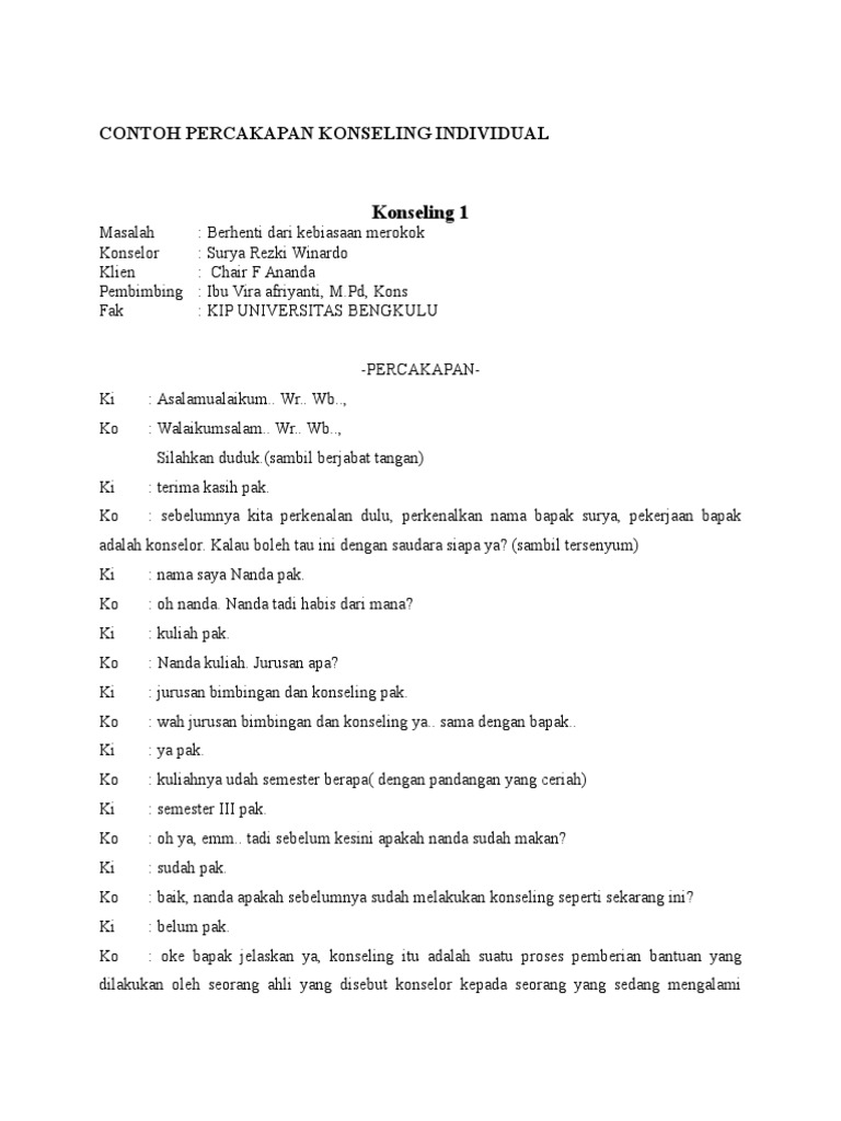 Konseling gestalt konseli berusia 14 tahun dan merupakan anak ke 3 dari 4 bersaudara. Dalam konseling ini setiap anggota kelompok berhak mengajukan pertanyaan mengutarakan masalahnya dan memberikan masukan kepada anggota lain yang masalahnya sedang dibahas. Model model konseling bk komprehensif konseling kelompok statistik sosial. Contoh dari formulir intake interview yang harus diisi oleh calon anggota. Layanan konseling kelompok adalah salah satu layanan dalam pelayanan bimbingan dan konseling yang juga memanfaatkan dinamika yang ada pada kelompok.