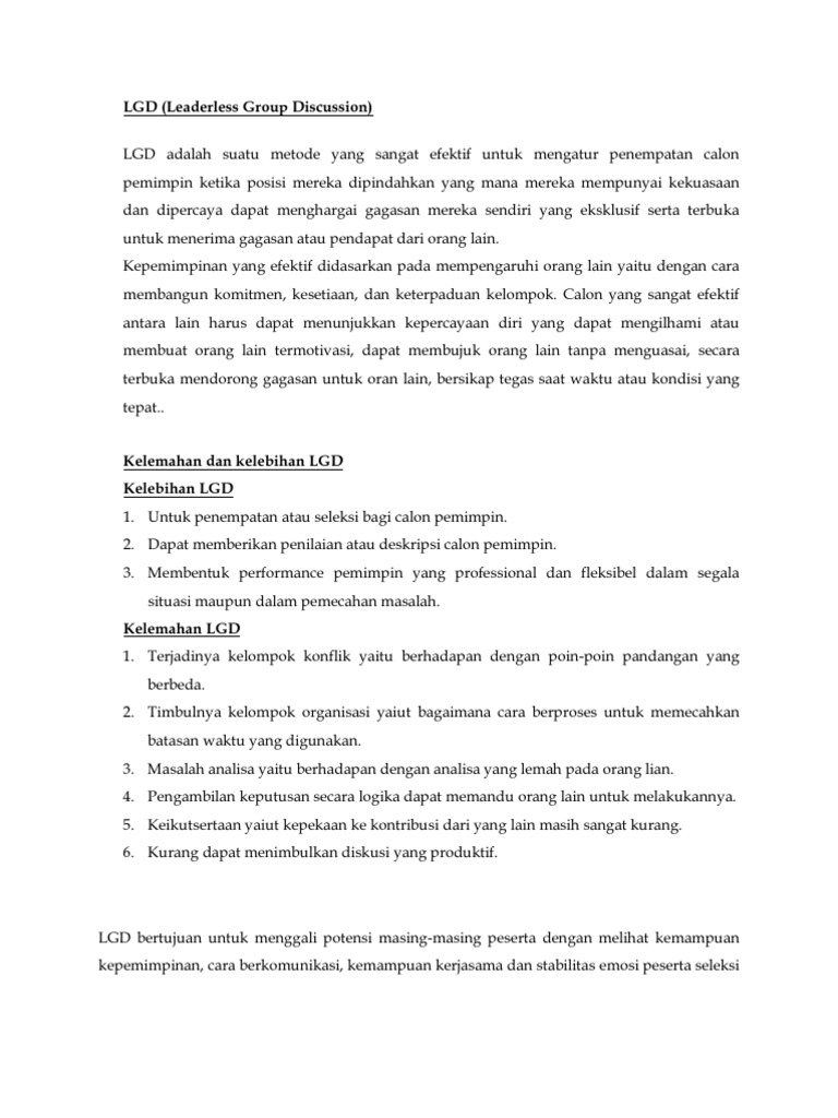 Fgd untuk seleksi pekerjaan biasanya dalam bentuk leaderless group discussion yang. Full contoh kasus leaderless group discussion pdf. Salah satu tools yang seringkali digunakan dalam assessment center adalah leaderless group discussion lgd. Leaderless group discussion di awal diskusi tidak terdapat kesepakatan posisi moderator pemimpin dan yang lainnya sehingga posisi para peserta sama. Leaderless group discussion atau lgd adalah diskusi kelompok tanpa. Assesor akan mengamati proses diskusi dan menyusun penilaian berdasarkan kompetensi peserta.