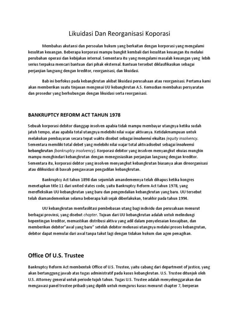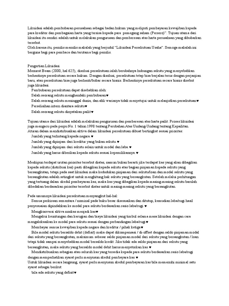 Proses likuidasi pada umumnya likuidasi persekutuan partnership liquidation melibatkan hal hal sebagai berikut. Mengakui keuntungan dan kerugian serta mengikuilidasi beban yang terjadi selama periode likidasi 3. Bisa kreditornya pesaing dan likuidasi atau stop operasi. Perusahaan yang melakukan merger adalah antara bank lippo dengan bank niaga. Cara composition berarti bahwa setiap tagihan sebesar rp 100 hanya akan dilunasi sebesar kurang dari rp 100 misalnya rp 75. Msaa prestasi tau prostitusi.