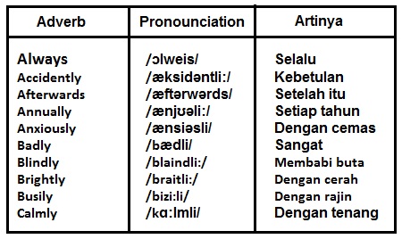 Kata keterangan atau kata tambahan adverbs berfungsi. Kata keterangan diperlukan untuk membuat sebuah kalimat bahasa inggriskata ini dapat berupa penjelasan mengenai suatu benda perasaan seseorang letak benda waktu serta tempat. Seperti yang mungkin anda duga kata keterangan dalam bahasa inggris banyak jumlahnya. Untuk menerangkan kata sifat adjectives this soup is too hot to eat. Kata keterangan dalam bahasa inggris terbagi menjadi beberapa jenis berikut penjelasan lengkapnya. Adverb of manner adlaah kata keterangan yang memberikan penjelasan mengenai bagaimana atau cara apa yag digunakan untuk melakukan suatu kegiatan.
