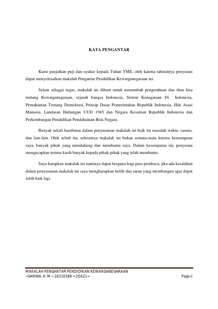 Contoh kata pengantar makalah pkn rabu februari 11 2015 beberapa contoh kata pengantar makalah pkn singkat khusus buat kamu yang sedang mengerjakan tugas pembuatan makalah mata pelajaran pkn. Contoh kata pengantar pada artikel ini diperuntukkan bagi mereka yang tengah mengerjakan tugas makalah khususnya pelajaran atau mata kuliah pendidikan kewarganegaraan. Puji syukur alhamdulillah kami panjatkan ke hadirat tuhan yang maha esa karena telah melimpahkan rahmat nya berupa kesempatan dan pengetahuan sehingga makalah ini bisa selesai pada waktunya. Kata pengantar makalah pkn contoh 1 kata pengantar alhamdulillah puji syukur saya panjatkan kepada allah swt yang masih memberikan nafas. Namun alangkah baiknya isi dulu kotak komentar sebelum anda menggunakannya. Segala puji syukur saya panjatkan kehadirat allah swt hingga saat ini masih memberikan sebuah nafas kehidupan dan anugerah akal sehingga saya bisa menyelesaikan pembuatan makalah ini secara tepat waktu dengan mengangkat judul implementasi makna semboyan bhineka tunggal ika.