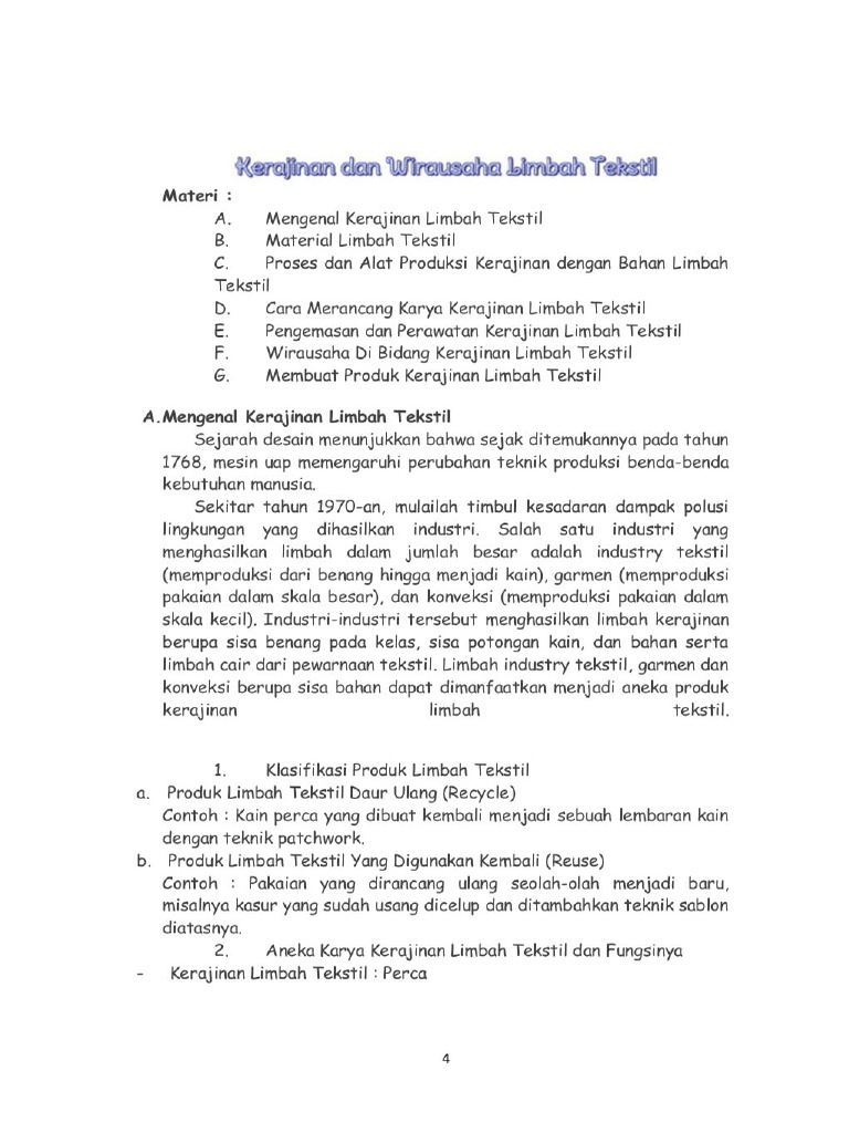 Jadi kerajinan limbah tekstil adalah suatu karya tangan yang dihasilkan oleh buangan dari suatu proses produksi baik industri maupun domestik rumah tangga. Pakaian yang dirancang ulang seolah olah menjadi baru misalnya kasur yang sudah usang dicelup dan ditambahkan teknik sablon diatasnya. Kerajinan tekstil modern merupakan karya tekstil yang dibuat dengan menggunakan alat bantu modern sehingga bisa membuat suatu produk tekstil dalam jumlah banyak. Kerajinan tekstil kamu tentu pernah suatu hari pergi jalan jalan ke mall. Di tempat tempat itu.