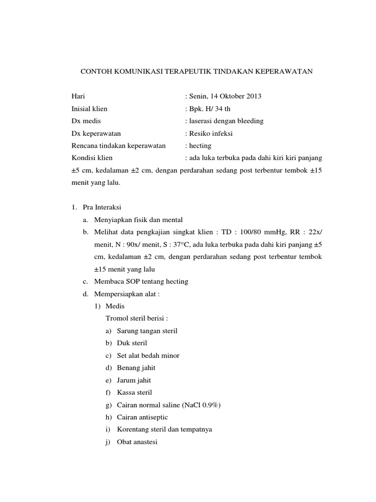 Perlak dan handuk kecil dibentangkan di bawah kepala. Dapat meringankan beban pikiran pasien. Mm menganggukkan kepala iya ibu itu memang efek dari luka yang ibu alamikarena pada luka ibu terjadi respon peradangan. Komunikasi terapeutik bukan pekerjaan yang. Beri kesempatan pada pasien untuk mengungkapkan rasa cemasnya. Dialog komunikasi terapeutik perawat dan pasien fase prainteraksi pada rumah sakit x di kamar y terdapat seorang pasien yang bernama odilia dewi dacosta umur 21 tahun dimana ia sekarang sedang menempuh pendidikan tinggi di salah satu universitas swasta yang berada di daerah z di rumah sakit tersebut ia ditemani oleh ibunya yang bernama rika dimana odilia tersebut sedang menjalani perawatan.