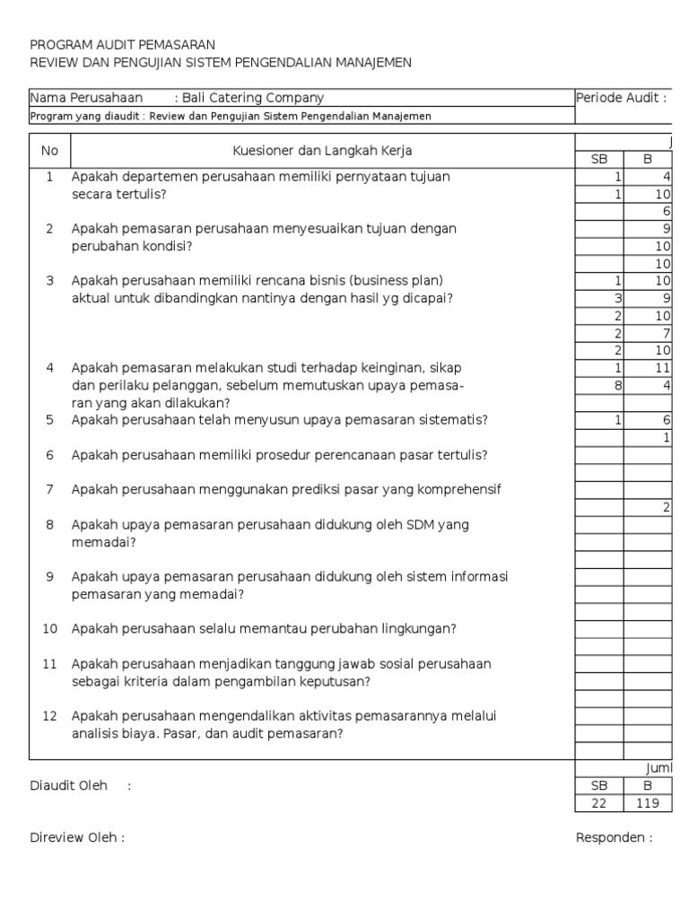 Contoh kuesioner audit sistem informasi. Tujuan pengendalian dan audit pengendalian pucuk pimpinan tujuan audit pengendalian pucuk pimpinan adalah untuk. Untu audit keuangan akuntansi manajemen keuangan akuntansi pemerintahan akuntansi sistem informasi akuntansi perpajakan akuntansi perilaku akuntansi perbankan dan masih banyak lagi. Contoh permasalahan audit sistem informasi sistem informasi audit jelaskan dan berikan contohnya masing masing. Kuesioner adalah suatu daftar pertanyaan yang harus di isi oleh responden sebagai sarana untuk mengumpulkan informasi tentang perilaku karakteristik keyakinan dan sikap sekelompok orang atau organisasi. Kuesioner yang baik biasanya terdiri dari surat permohonan menjadi responden lembar persetujuan menjadi responden dan kuesioner. Pengertian kuesioner angket.