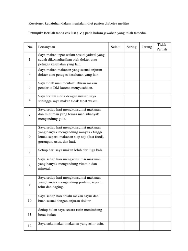 Contoh kuesioner diabetes melitus tipe 2. Pasien dengan diagnosa diabetes melitus tipe 2 dengan atau tanpa komplikasi di instalasi rawat jalan rsud drmoewardi surakarta dan bersedia menjadi responden. Pengetahuan kepatuhan diabetes melitus tipe 2 rsud. Penyakit diabetes mellitus merupakan penyakit yang bersifat. 4 untuk mengetahui gambaran proporsi kadar gula darah puasa penderita diabetes melitus tipe 2 yang mendapat terapi diet. Ada 1 macam 1 4. Abstract diabetes mellitus is a metabolic disorder disease caused by the pancreas does not produce enough insulin or the body can not use effectively produced insulin.