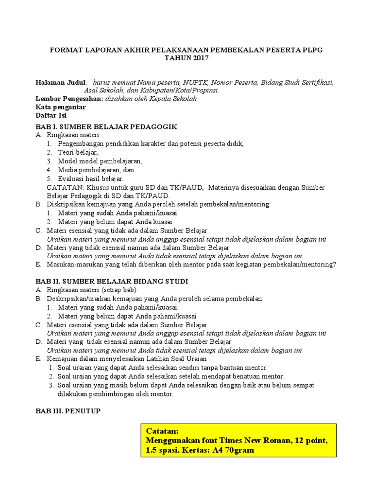 Untuk mempermudah rekan rekan peserta plpg 2017 disini kami akan. Contoh laporan akhir pembekalan plpg tahun 2017 bagi bapak ibu guru peserta plpg 2017 yang sudah dinyatak lulus dalam utn ulang 1 makan anda harus melanjutkan menuju ke tahap berikutnya yaitu mengerjakan tugas untuk membuat laporan akhir pembekalan materi plpg tahun 2017. Contoh laporan akhir pembekalan plpg 2017 terbaru pada postingan sebelumnya kami telah membagikan daftar nama yang lulus utn ulang 1 tahun 2017 baca disini bila anda peserta plpg tahun 2017 yang telah lulus utn ulang 1 tahap selanjutnya anda memiliki bertugas membuat laporan pembekalan materi plpg 2017 sebagai tugas akhir. Pada kesempatan kali ini kami ingin membantu para guru yang telah. Download contoh laporan akhir pembekalan plpg 2017bagi para guru yang menjadi peserta plpg tahun 2017 dan telah dinyatakan lulus pada utn ulang 1 mereka harus melanjutkan ke tahap selanjutnya yaitu mengerjakan tugas dan membuat laporan pembekalan materi plpg tahun 2017 sebagai tugas akhir. Maka dari itu pada kesempatan kali ini untuk membantu rekan rekan peserta plpg kami akan membagikab format laporan.