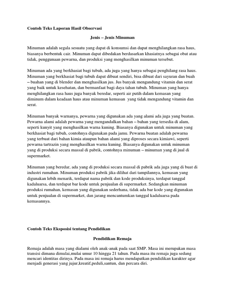 Dalam undang undang sistem pendidikan nasional no20 tahun 2003 dijelaskan n bahwa. Objektif berarti teks laporan hasil observasi disajikan sesuai dengan keadaan objek yang sebenarnya di lapangan tanpa dipengaruhi pandangan atau pendapat pribadi. Contoh teks laporan hasil observasi tentang pendidikan pentingnya pendidikan di indonesia pendidikan merupakan hal yang paling penting untuk anak atau kita karena pendidikan suatu jenjang mendidik karakter kita. Sedangkan untuk teks hasil observasi memiliki pengertian yaitu isi teks yang menjelaskan tentang sesuatu informasi baik itu informasi tentang hewan tanaman fenomena alam hasil karya manusia dan fenomena sosial yang sesuai. Singkat kata teks laporan hasil observasi adalah sebuah teks yang. Pendidikan adalah investasi jangka panjang yang harus diperhatikan disiapkan dan diberikan sarana dan prasarananya dengan baik.