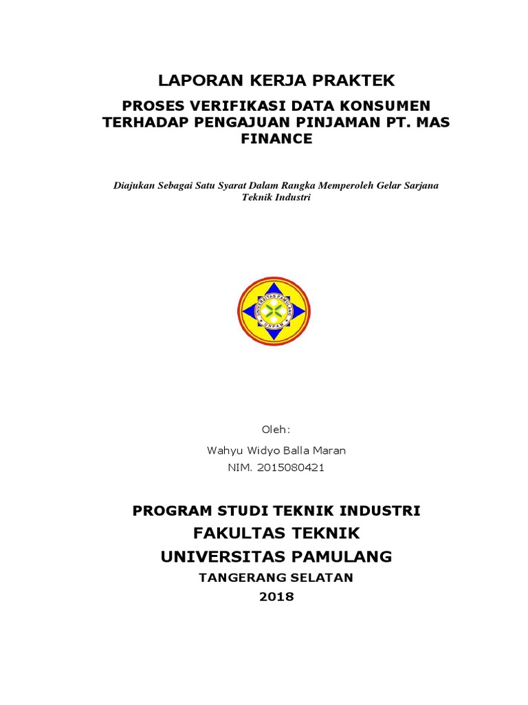 Laporan kerja praktek jurusan teknik industri universitas negeri gorontalo. Silahkan simak berikut ini untuk kamu yang ingin download dalam file format docx atau pdf juga bisa nanti dikasih link nya. Save save laporan kerja praktek teknik industri itb for later. Tujuan dari penyusunan laporan praktek kerja industri ini adalah untuk memenuhi salah satu syarat dalam menempuh ujian akhir prakerin tahun pelajaran 20122013laporan ini disusun berdasarkan data yang sesungguhnya yang penulis dapatkan selama melaksanakan praktik kerja industri di dd computer system. Laporan ini telah diterima setelah diperiksa oleh pembimbing lapangan sebagai bukti bahwa saya telah melaksanakan praktek kerja industri prakerin tanggal 7 februari sd 6 mei 2013 dengan baik dan sebagai salah satu syarat untuk mengikuti ujian akhir sekolah uas dan ujian nasional un. Laporan hasil praktek kerja industri ini disusun sebagai salah satu syarat untuk mengikuti ujian akhir nasional.