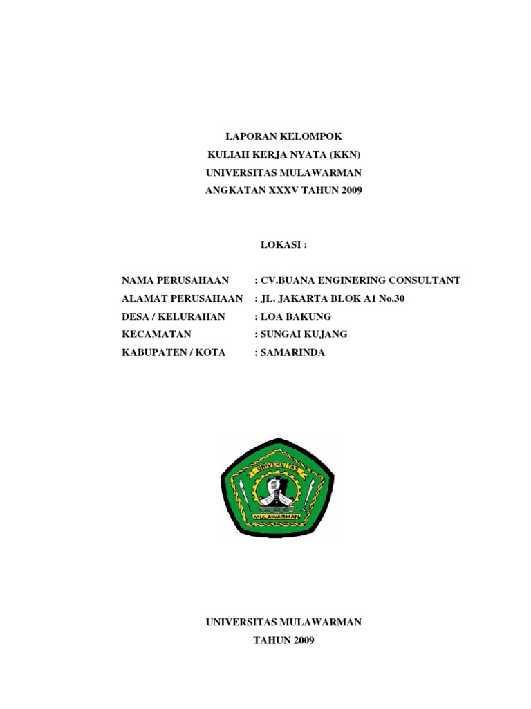 Laporan kkn ini berisi bab i bab ii dan bab iii. Pelaksanaan kkn di desa pasauran terbagi menjadi 3 kelompok. Sementara itu contoh lengkap laporan kkn untuk stain iain dan uin di bawah ini diambil dari salah satu laporan kkn dari iain walisongo. Laporan kelompok merupakan syarat wajib bagi mahasiswa kuliah kerja nyata universitas mahasaraswati denpasar. Dengan selesainya laporan kkn ini diharapkan dapat digunakan sebagai bahan pertimbangan dalam pemberian nilai mata kuliah kkn. Segenap pihak yang telah membantu pelaksanaan kuliah kerja nyata hingga pembuatan laporan yang tidak dapat kami sebutkan satu per satu.