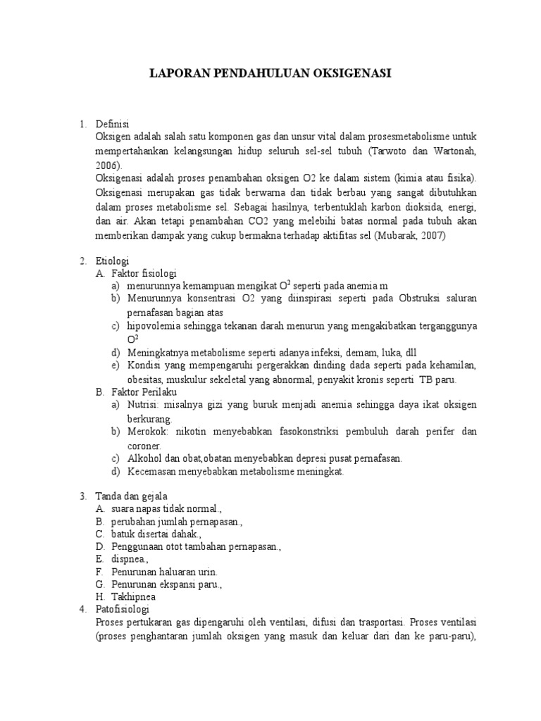 Laporan pendahuluan chf congestive heart failure a. Di ruang kenanga rsud goetheng tarunadibrata. Apabila lebih dari 4 menit orang tidak mendapatkan oksigen maka akan berakibat pada kerusakan otak yang tidak dapat diperbaiki dan biasanya. Laporan pendahuluan oksigenasi a. Sebagai hasilnya terbentuklah karbon dioksida energi dan air. Defenisi oksigen adalah salah satu komponen gas dan unsur vital dalam proses metabolisme untuk mempertahankan kelangsungan hidup seluruh sel sel tubuh tarwoto dan wartonah 2006.