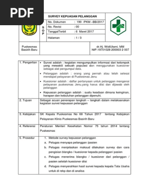 Kuisioner survei kepuasan masyarakat di sman 1 gondang mojokerto tahun 2014 2015. Mengetahui gambaran kepuasan masyarakat yang diperoleh dari hasil pengukuran atas pendapat masyarakat terhadap mutu dan kualitas pelayanan kesehatan yang telah diberikan oleh rumah sakit jiwa sambang lihum provinsi kalimantan selatan pada tahun 2016. Contoh standar operasional prosedur ini dengan form survey kepuasan pelanggan serta contoh format penilaian kepuasan pelanggan semoga bisa bermanfaat dan membantu anda. Dalam laporan ini disampaikan tentang langkah langkah penyusunan indeks kepuasan masyarakat yang meliputi persiapan pengumpulan data pengolahan. Sebelumnya survei kepuasan masyarakat diatur dalam peraturan kep menpan â kep25mpan22004 tentang pedoman umum penyusunan ikm unit pelayanan instansi pemerintah namun dikarenakan belum mengacu kepada uu nomor 25 tahun 2009 tentang pelayanan publik dan perlu adanya keselarasan dengan standar pelayanan maka diubah menjadi peraturan menteri pendayagunaan aparatur negara dan reformasi. Survey indeks kepuasan masyarakat ikm tahun 2011 ini merupakan survey tahun ke tiga yang dilaksanakan di puskesmas gunung muda.