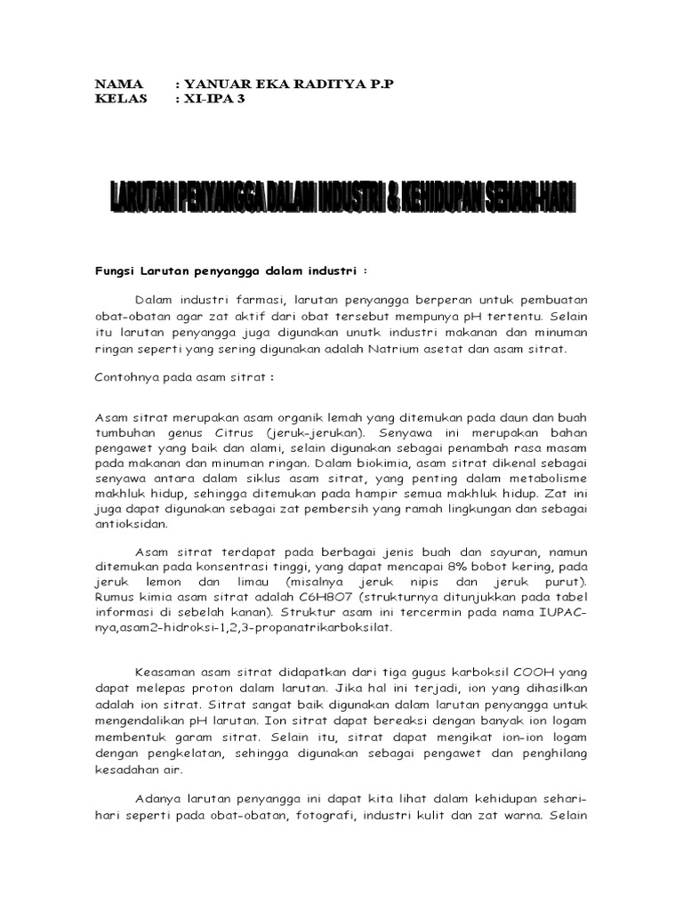 Contoh larutan penyangga dalam kehidupan sehari hari. Larutan penyangga dalam kehidupan sehari hari. Asam asetat banyak digunakan sebagai cuka makanan seperti pada bakso asam sulfat digunakan sebagai larutan elektron pada sel aki accumulator asam benzoat banyak digunakan pada industri makanan sebagai bahan pengawet. 3adanya larutan penyangga ini dapat kita lihat dalam kehidupan sehari hari seperti pada obat obatan fotografi industri kulit dan zat warna. Dalam reaksi reaksi kimia tersebut dibutuhkan ph yang stabil. 4menjaga ph pada plasma darah agar berada pada ph berkisar 735 745yaitudari ion hco3 dengan ion na. Dalam tubuh manusia ph darah harus dijaga pada 735 745.