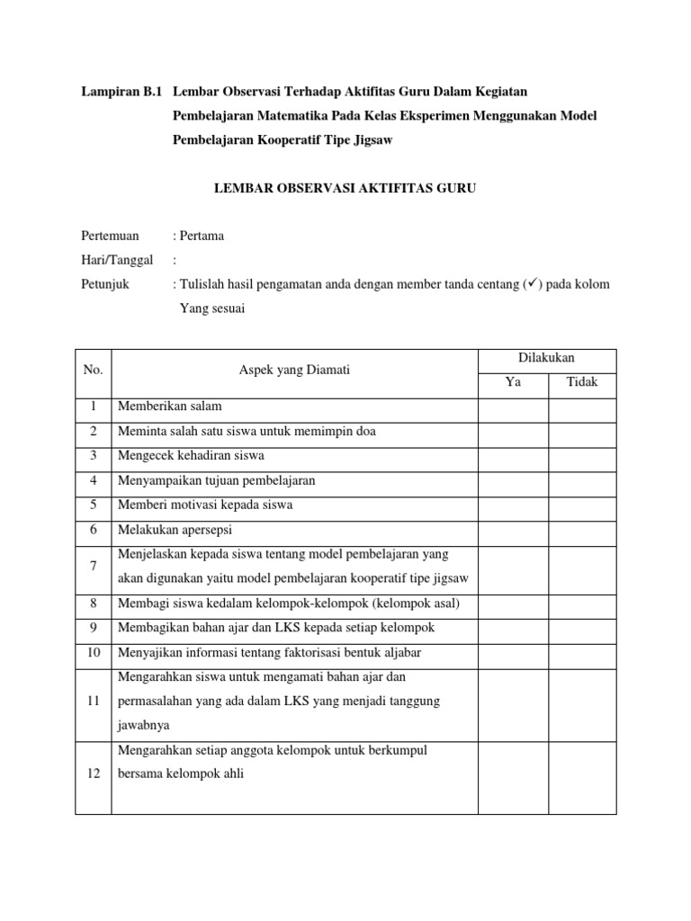 Menyapa siswa dan melakukan apersepsi. Berikut ini beberapa contoh lembar observasi yang dapat digunakan oleh seorang observer. Mereka sudah berusaha mencari cari lembar observasi atau instrumen untuk pengamatan tersebut di mana mana di literatur maupun internet. 3 observasi kelompok ialah pengamatan yang dilakukan oleh sekelompok tim peneliti terhadap sebuah isu yang diangkat menjadi objek penelitian. Mudah mudahan artikel blog ptk dan model pembelajaran kali ini dapat bermanfaat buat anda. Misalnya mempelajari efek homeschooling pada kemampuan kritis siswa.